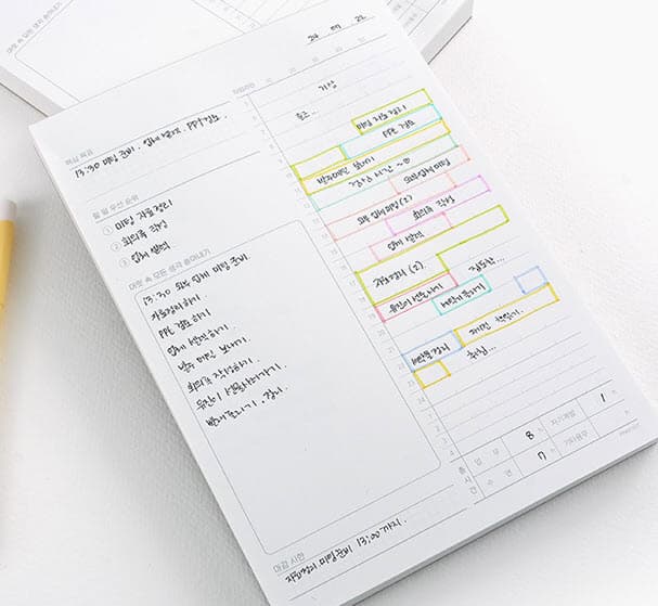 예상된 계획을 작성한 뒤, 색깔 펜으로 실제 수행한 시간 및 업무량 등을 그 위에 덧붙여 주세요!